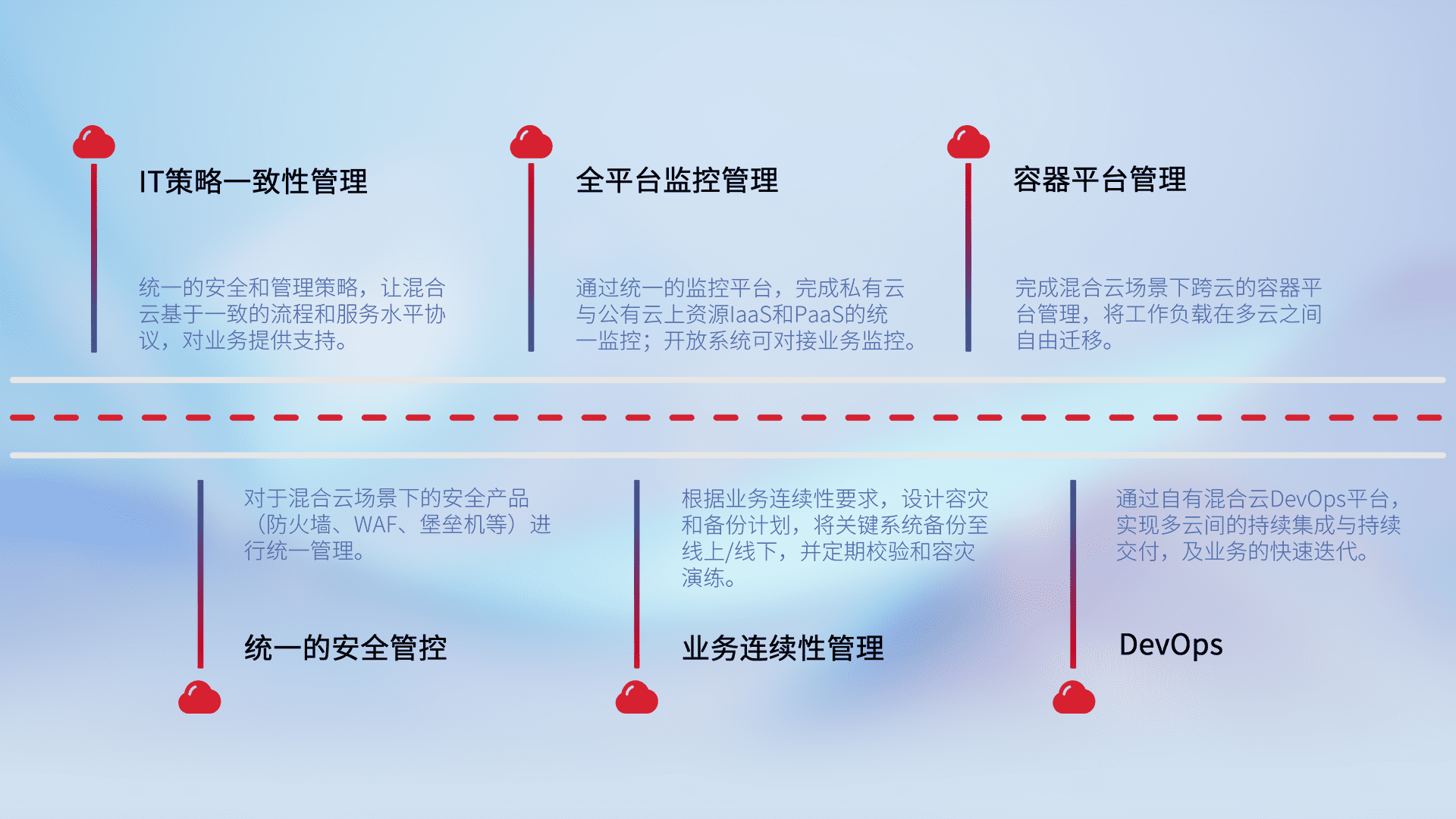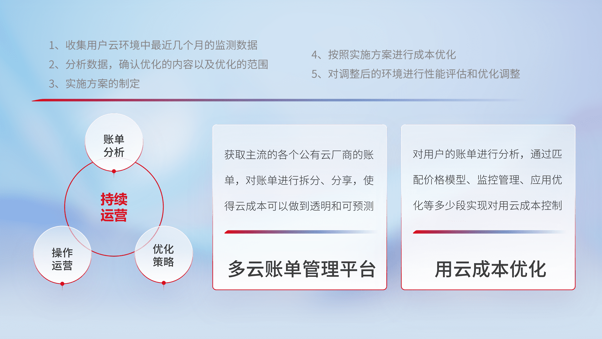 通过多云纳管,,,,以统一的资源数据模型把客户的云资源进行抽象和封装,,,,进而实现对多云资源的统一操作,,,,保障云资源管理的可靠性、、、稳定性与可用性。。量身定制化运维内容,,配置、、、开发运维、、补丁管理、、备份、、监控、、、、认证和访问管理、、、审计和日常巡检等,,,保障在用云过程中的可靠度,,,稳定度以及高可用率。。。。
