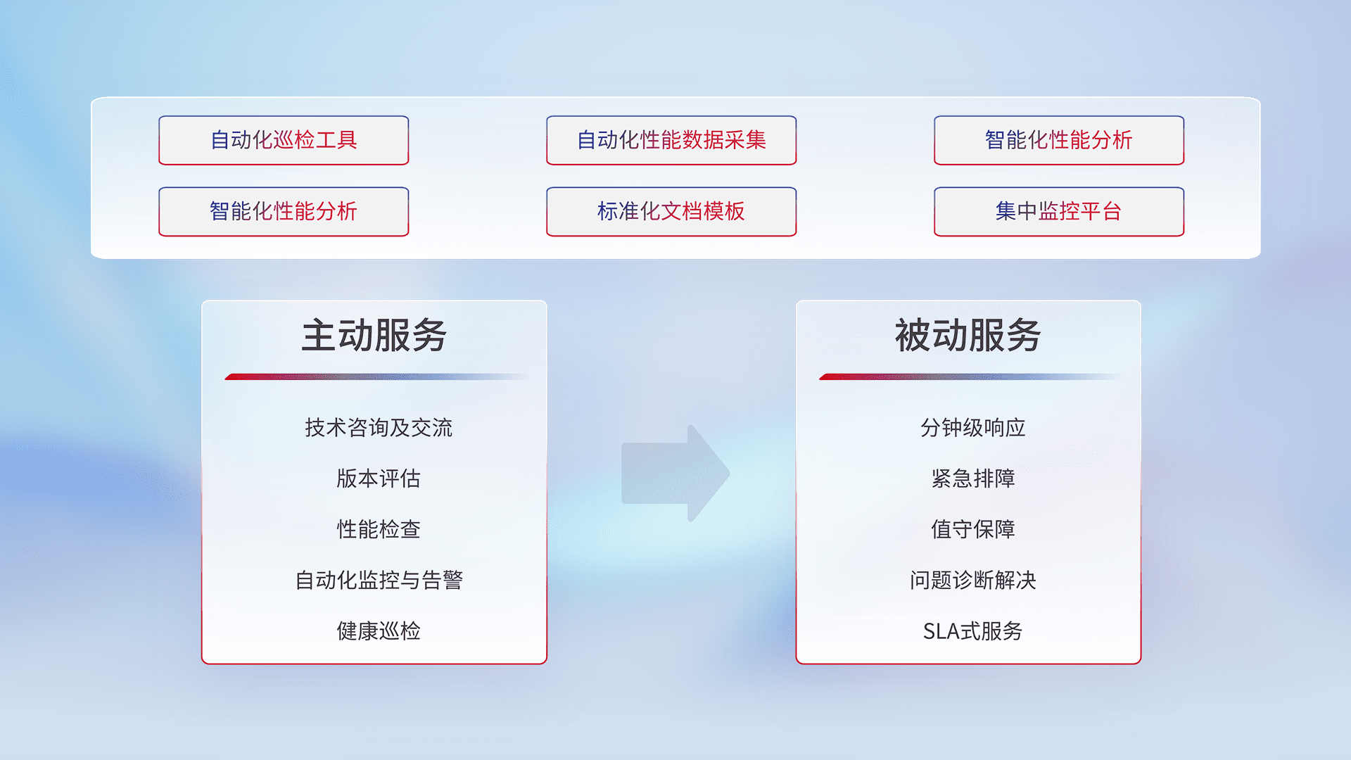 智能化工具和标准化文档,,,,保障服务质量,,提供主动服务(包含技术咨询、、版本评估、、、性能检查、、自动化监控与告警、、健康巡检)和被动服务包含(分钟级响应、、、、紧急排障、、、、值守保障、、问题诊断解决、、、SLA服务)。。。。